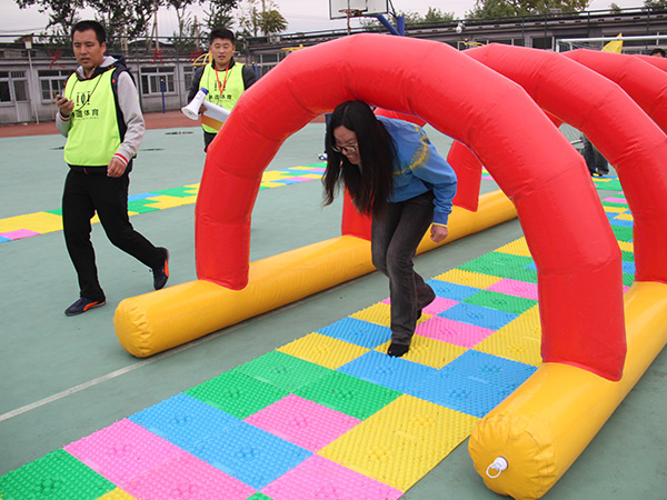 比赛规则:每队4名参赛队员,至少1名女队员。比赛场地分A、B、C、D四点,共有4个挑战任务,需光脚完成各点任务,最终按用时进行排名。A点队员任务:原地跳绳,累积成功10个,完成后跑至B点,与B点队员击掌;B点队员任务:仰卧起坐5个,由A点队员协助按住脚,完成后跑至C点,与C点队员击掌;C点队员任务:蒙眼障碍跑,跨过充气道具跑至D点,与D点队员击掌;D点任务:踢毽5次,跑回A点,与A点队员击掌并喊出“完成”,计时停止。用时短者名次列前。